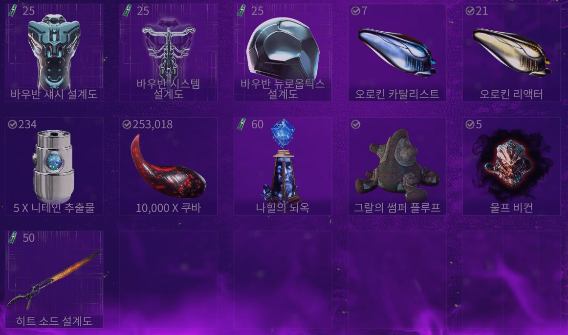 <바우반 부품 25크래드, 카탈 리액터 75크래드, 니테인 x5 15크래드, 쿠바와 무기 설계도 50크래드, 나힐의 뇌옥 60 크래드, 그랄의 썸퍼 플루프 40 크래드, 울프 비컨 50 크래드>