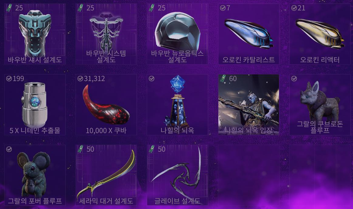 <바우반 부품 25크래드, 카탈 리액터 75크래드, 니테인 x5 15크래드, 쿠바와 무기 설계도 50크래드, 나힐의 뇌옥 60크래드, 나힐의 뇌옥 입장 60크래드, 그랄 플루프 40크래드>