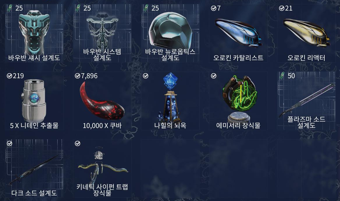 <바우반 부품 25크래드, 카탈 리액터 75크래드, 니테인 x5 15크래드, 쿠바와 무기 설계도 50크래드, 나힐의 뇌옥 60크래드, 에미서리 장식물 40크래드, 키네틱 사이펀 트랩 장식물 40크래드>