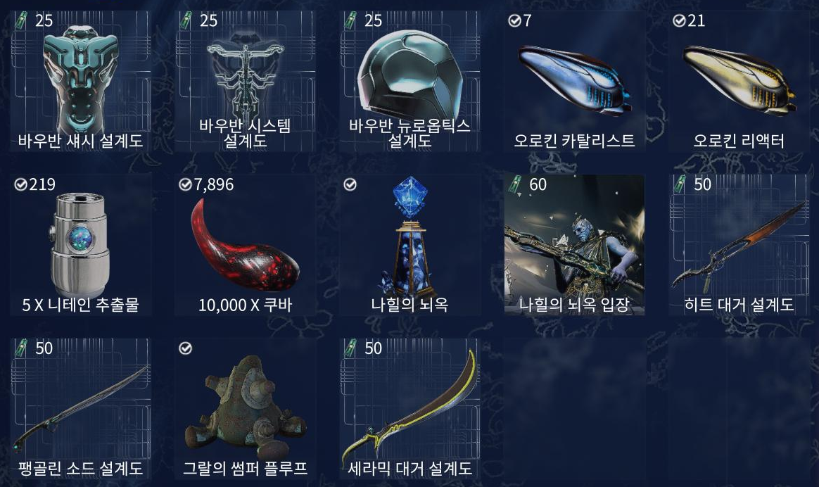 <바우반 부품 25크래드, 카탈 리액터 75크래드, 니테인 x5 15크래드, 쿠바와 무기 설계도 50크래드, 나힐의 뇌옥 60크래드, 나힐의 뇌옥 입장 60크래드, 그랄의 썸퍼 플루프 40크래드>