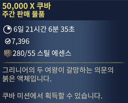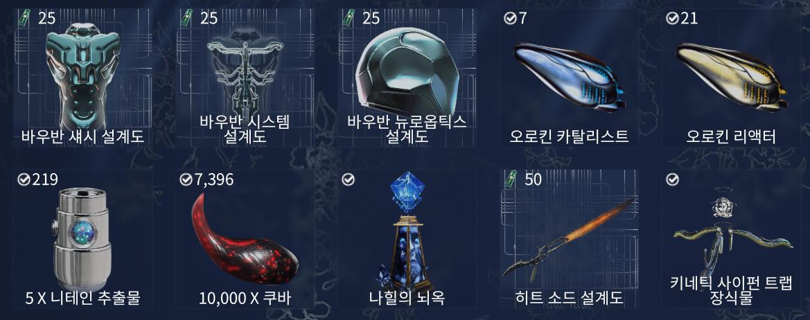 <바우반 부품 25크래드, 카탈 리액터 75크래드, 니테인 x5 15크래드, 쿠바와 무기 설계도 50크래드, 나힐의 뇌옥 60크래드, 키네틱 사이펀 트랩 장식물 40크래드>